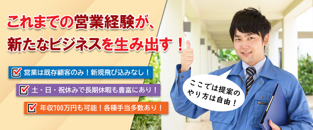 | 仕事内容 | 下記の業務を担当していただきます。 ①営業として、担当顧客及びJOBの契約履行業務。 ②担当顧客・JOBへの、派生提案活動。 技術指導、工程調整、 派生工事立ち合い等。 ③中長期保全計画立案... |