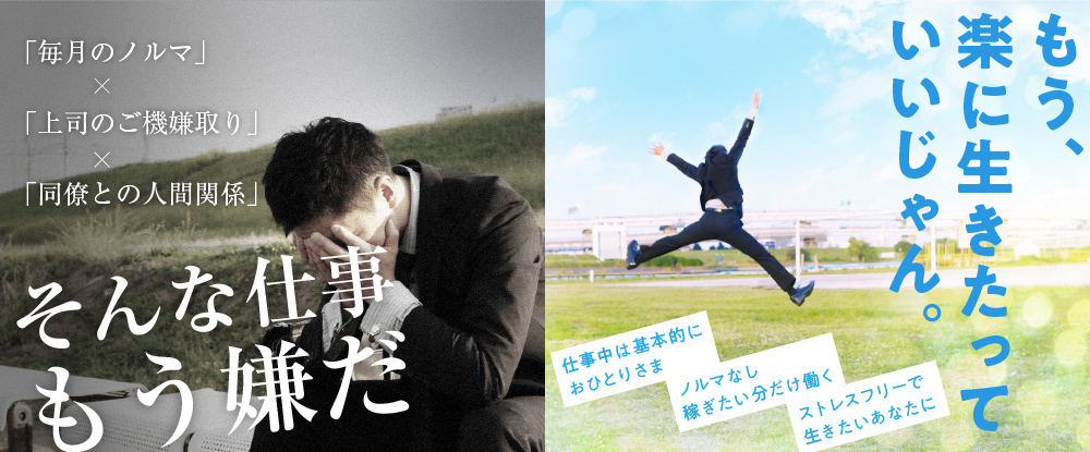| 給与 | ★月収25万円~60万円(売上による) ★東京・千葉・神奈川・埼玉の事業所就業の場合は入社祝い15... |