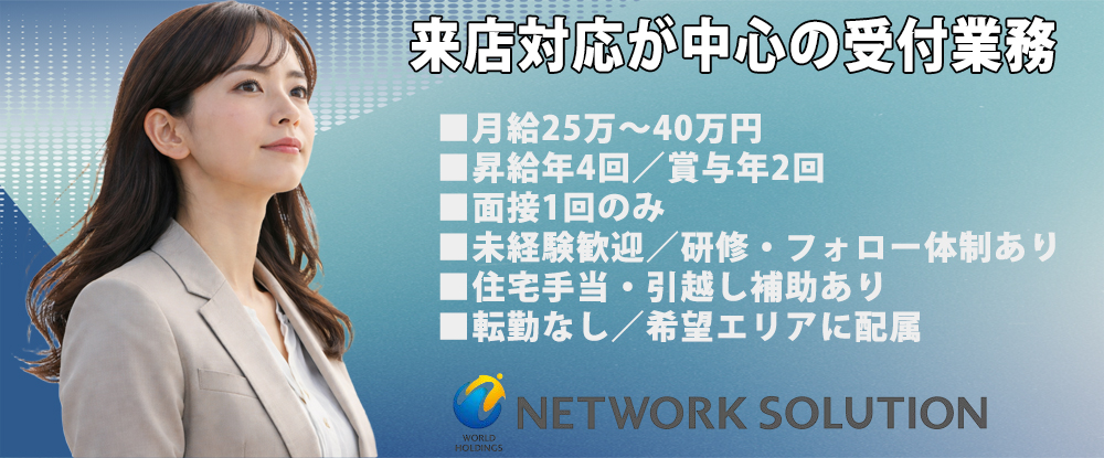 ■月給25万~40万円 ■昇給年4回/賞与年2回 ■個人ノルマなし(受付・来店対応中心) ■売り込み営業なし ■面接1回のみ ■住宅手当・引越し補助あり ■月9~10日休/残業1日30分~1時間 ■...