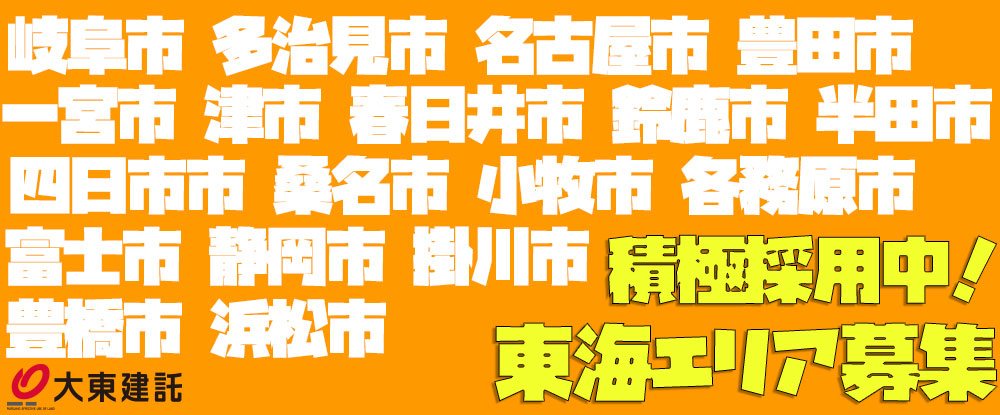 | 勤務地 | ●関西 大阪、京都、滋賀 ●東海 愛知、静岡、岐阜、三重 ★通勤時間を考慮して担当物件を決定 ※勤... |